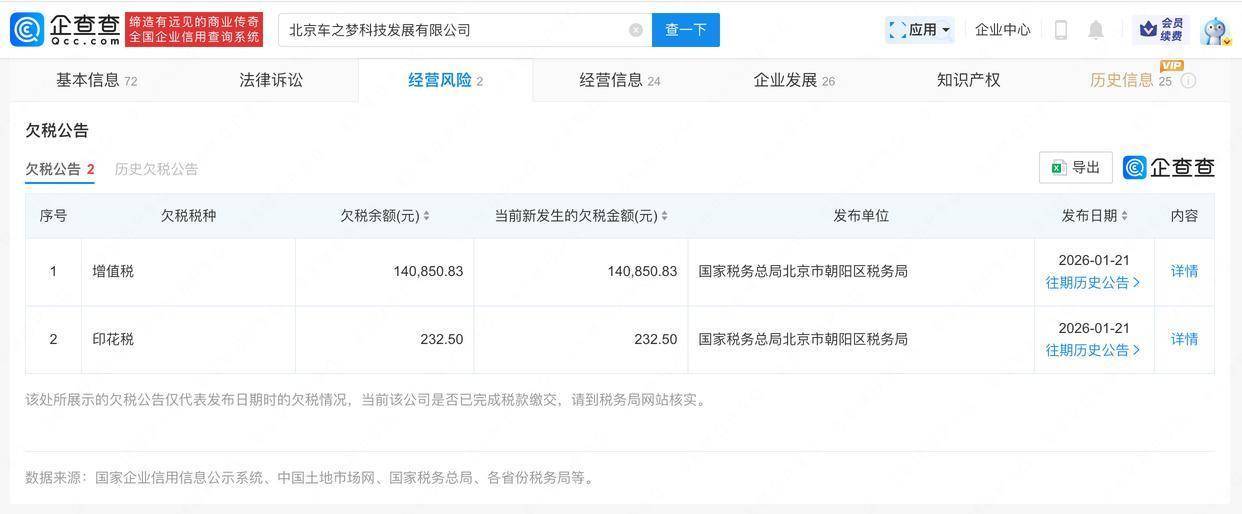 企查查APP显示,近日,北京车之梦科技发展有限公司新增两则欠税公告信息,欠税余额总计14.1万余元,欠税税种包括增值税、印花税精选期货配资,发布单位为国家税务总局北京市朝阳区税务局。企查查信息显示,该公司成立于2004年8月,注册资本35.43万元,黄子韬持股97%。